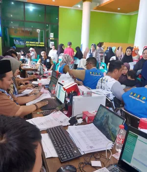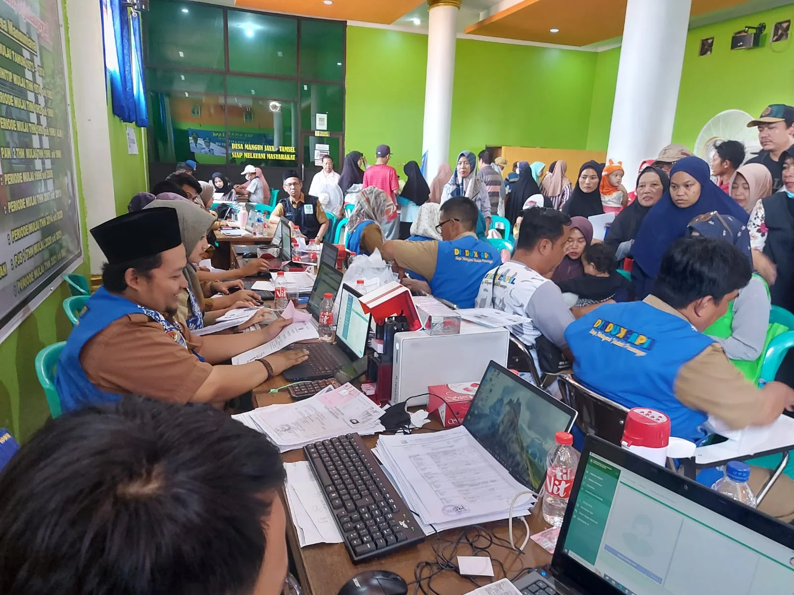Kegiatan ini salah satu program Pj Bupati Bekasi tiap kecamatan Tambun Selatan, Kabupaten Bekasi. Warga datang antre mengurus keperluan administrasi kependudukan.