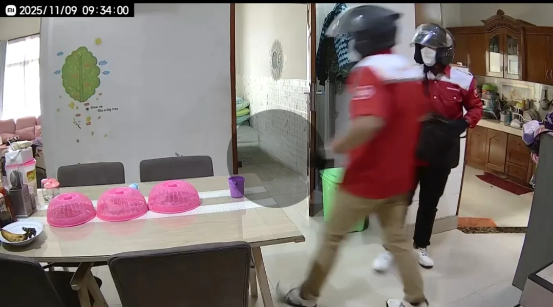 Pencurian itu terekam kamera CCTV, memperlihatkan dua orang pelaku memakai seragam merah, helm, dan masker, dengan santainya mengobrak-abrik seisi rumah mencari barang berharga milik korban.