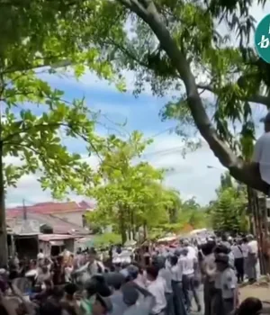 Di tengah kerumunan, seorang siswa terlihat antusias memanjat pohon demi bisa melihat langsung sang presiden. Aksi ini menunjukkan betapa besarnya antusiasme masyarakat, khususnya para pelajar, terhadap sosok Presiden Prabowo.