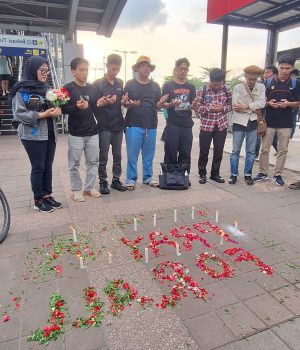 Infobekasi.co.id – Sebanyak belasan peserta Aksi Kamisan Kota Bekasi melaksanakan kegiatan tabur bunga dan menyalakan lilin di depan pintu masuk Stasiun Bekasi Timur, Kamis 30 April 2026. Kegiatan ini diadakan sebagai bentuk penghormatan dan belasungkawa bagi 16 orang korban jiwa dalam peristiwa tabrakan mematikan antar kereta terjadi sebelumnya.